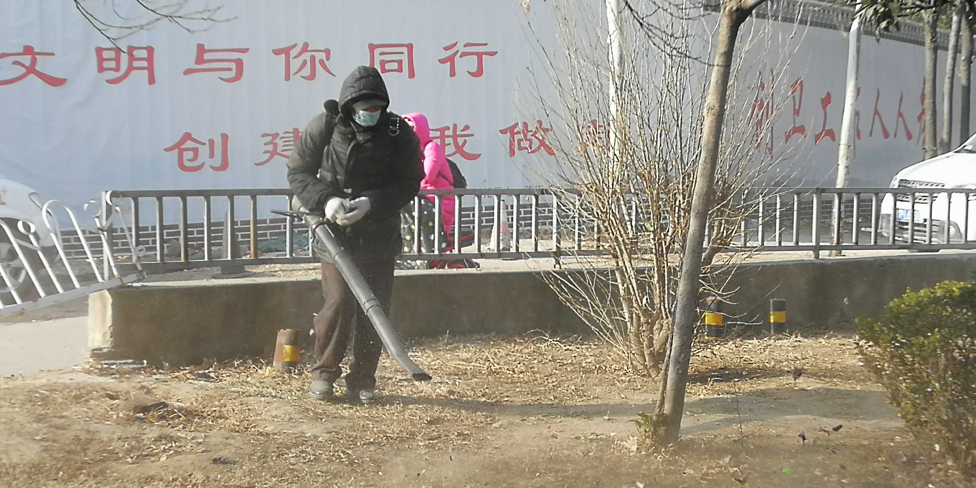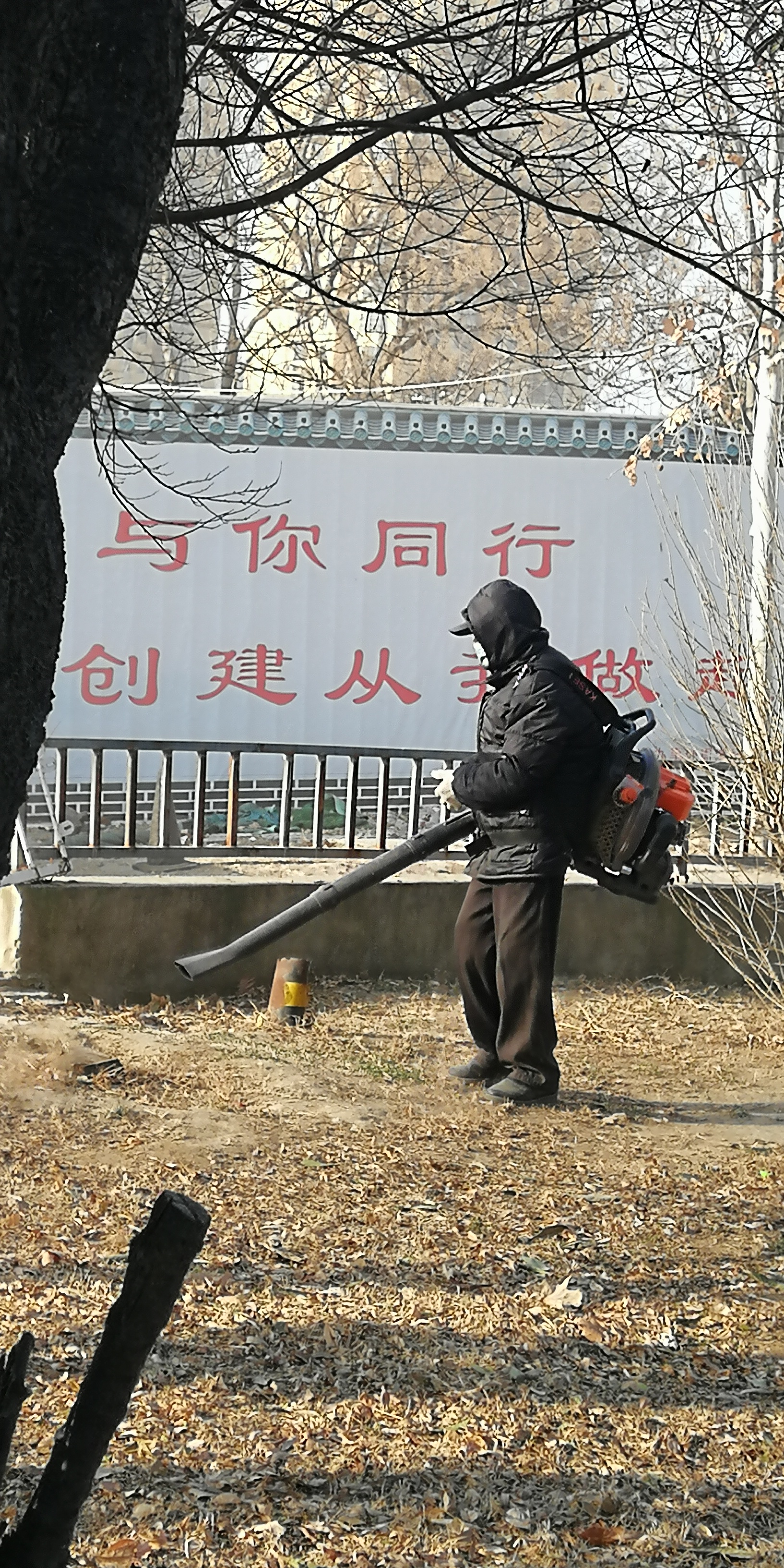 2月11日,大年三十。在川匯區濱河路上,工作人員背著吹風機清理游園內的落葉和垃圾。工作人員介紹,這樣便于更快更好地工作。(周口日報·周道客戶端記者 馬月紅)②7
