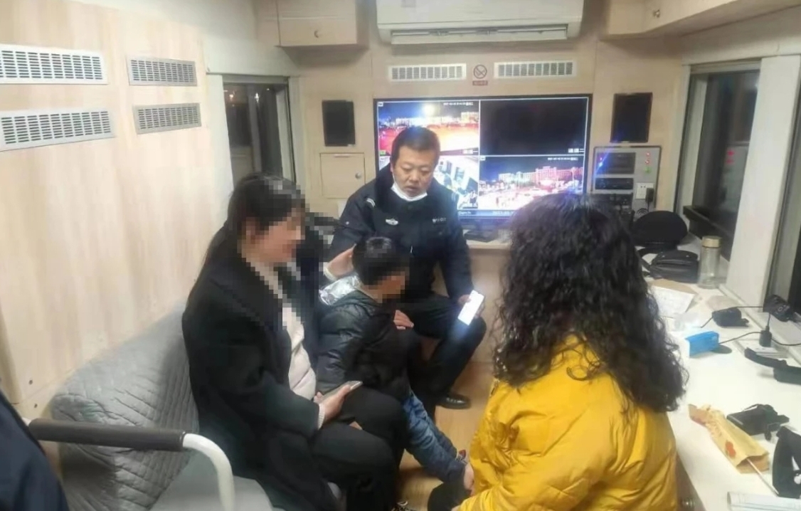 巡特警隊員開著巡邏車在廣場見人就問,晚10時許,值勤隊員終于找到男童的母親,其母親名叫吳曉萌,母子倆得以團聚。