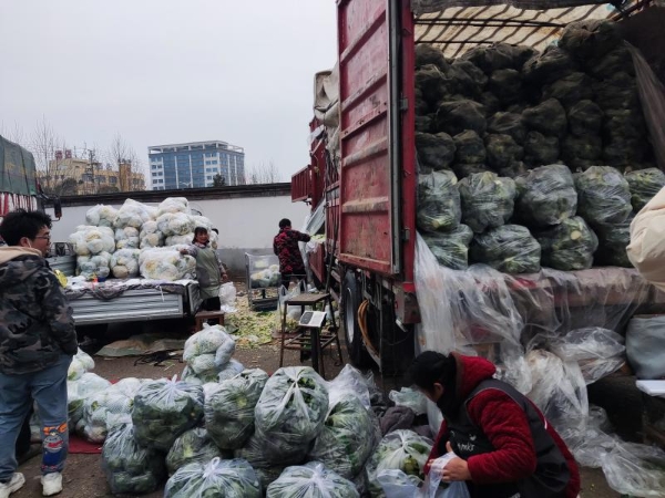 相比于肉類區,蔬菜區停了很多送貨的小三輪,大多是前來批發的散戶,大包小包往三輪里裝。據商販李大姐介紹,臨近春節,天氣寒冷,有一些蔬菜的價格略有上漲,但整體價格并不是很高。她主要是做花菜批發,因為花菜能長期存放,所以價格并不高,只有一塊錢一斤?!皟r格比之前要低一點,但是銷量上升很多,薄利多銷吧?!崩畲蠼阏f。